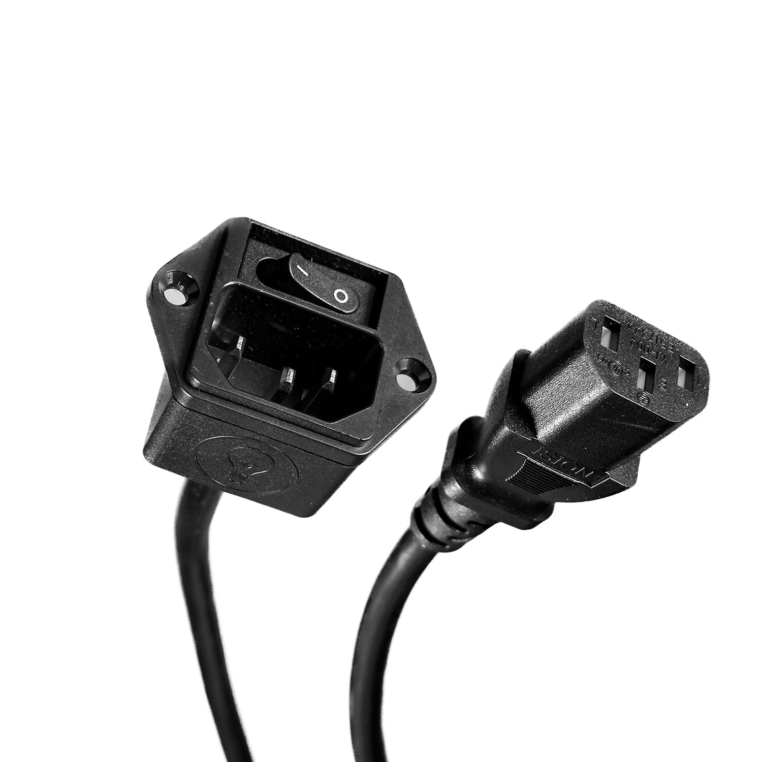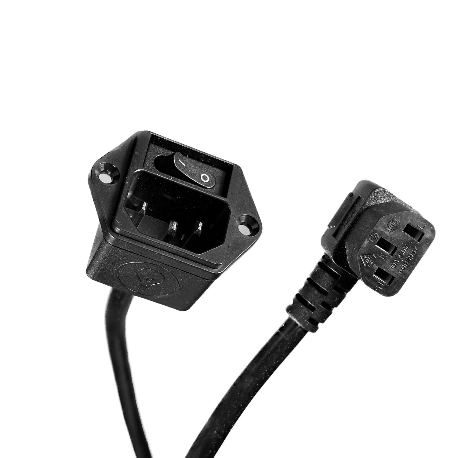 We start with a top quality IEC male connector and solder a 22 inch straight female lead onto it and cover the solder connections with an insulated cover. Simply use the mounting screws to connect it seamlessly to your Elevation V3 power opening.